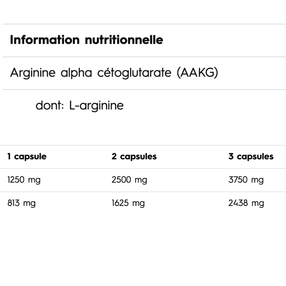 Ingrédients : 88% L-arginine alpha-cétoglutarate (AAKG), antiagglomérant: sels de magnésium d’acides gras; gèlule: gèlatine.