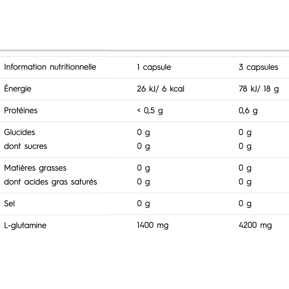 Ingrédients: 89,5% L-glutamine, agent de charge – cellulose microcristalline, anti-agglomérant sels de magnésium d’acides gras, gélule (gélatine, colorant: E 171).